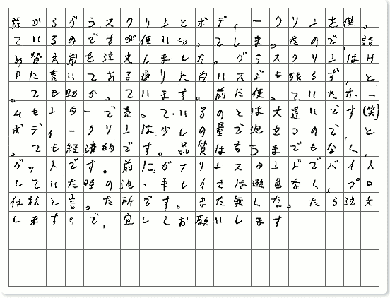 前からグラスクリンとボディークリンを使っているのですが使い切ってしまったので、詰め替え用を注文しました。